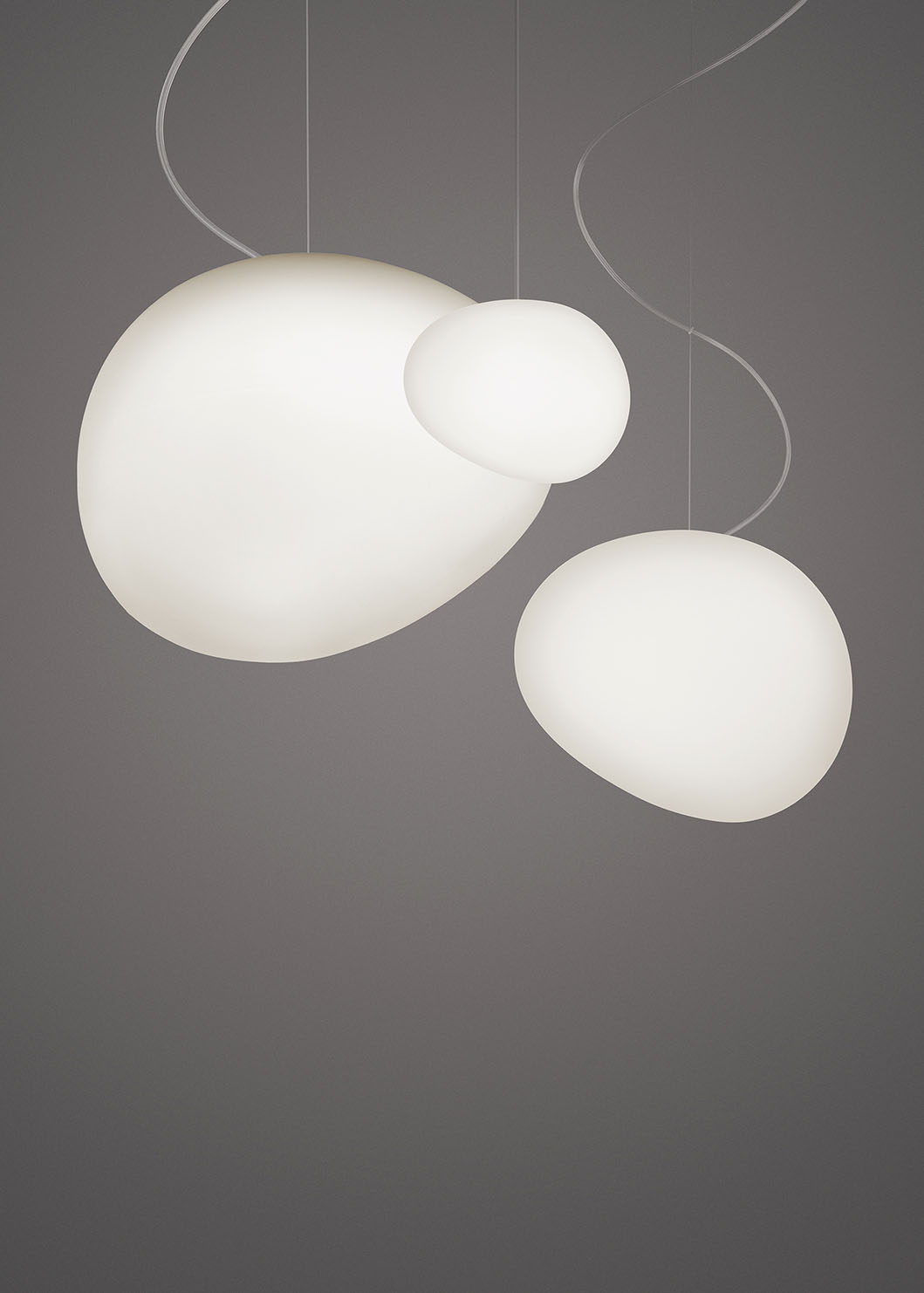 Organic and poetic shapes made of hand-blown glass, for a family of suspension lamps that includes various sizes, which can be used stand-alone or in multiple compositions. Versatile and multifarious, thanks to the closed shape of the diffuser, it can also be used at various heights.
