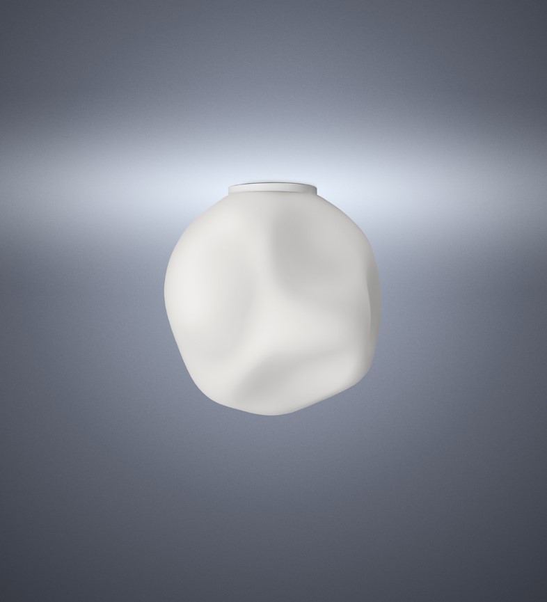 Made in opaque blown glass, Hoba ceiling lamps have an asymmetrical and irregular shape, reminiscent of a meteorite crystallized in mid-flight. They emit a warm and embracing light.